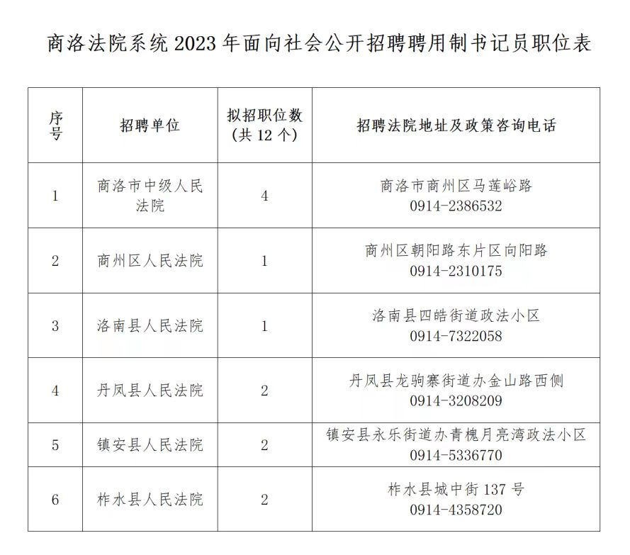 全市法院共招聘聘用制書記員12名,各法院招聘職位、地址及政策咨詢電話詳見《商洛法院系統(tǒng)2023年面向社會(huì)公開招聘聘用制書記員職位表》(附件)。